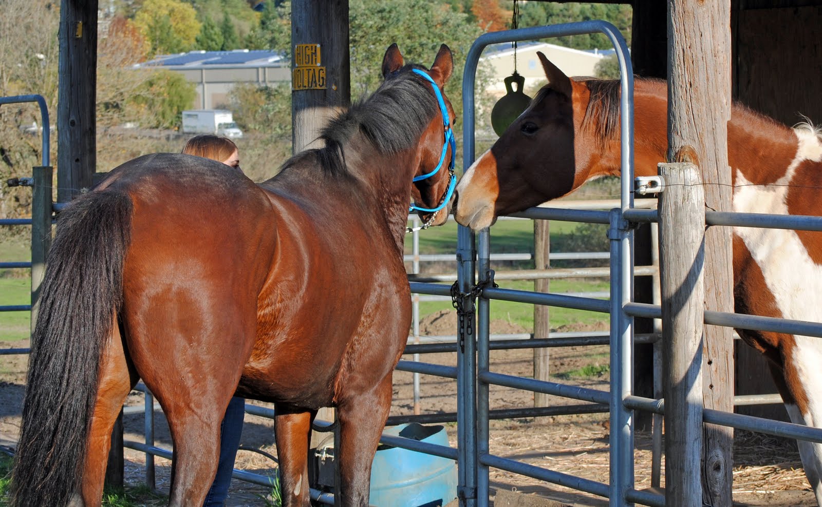 Bar circled the parking lot once, then allowed a woman on a different spotty horse to catch him. Went right up to her, as a matter of fact. Which, of course, is what one does when one is a racehorse--you go to that pony horse for safety.